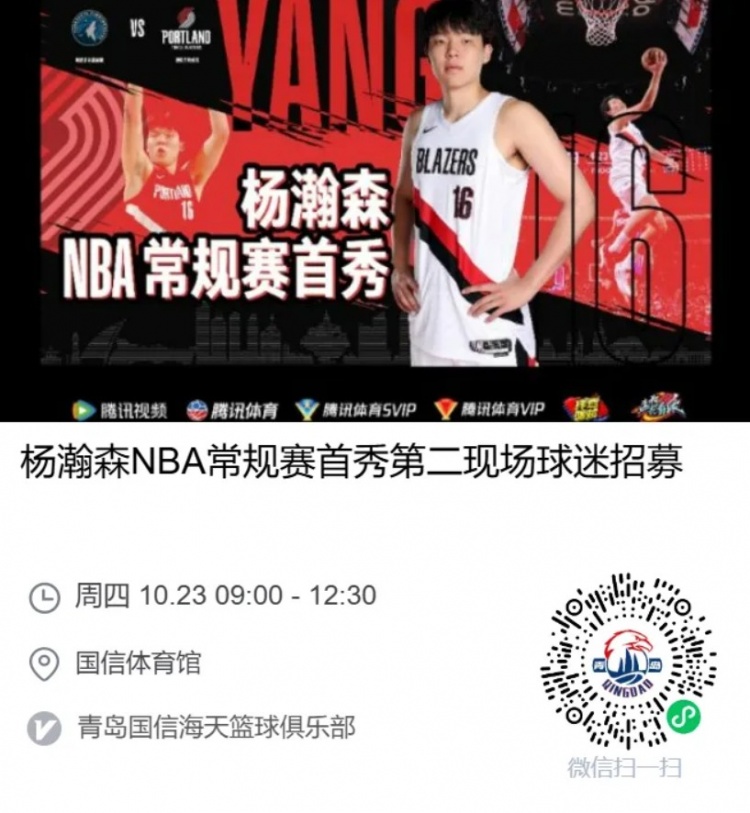 参与杨瀚森NBA常规赛首秀,惊喜福利送不停,到场观赛即有机会参与互动,赢取杨瀚森专属T恤以及由腾讯提供的NBA球队周边产品!